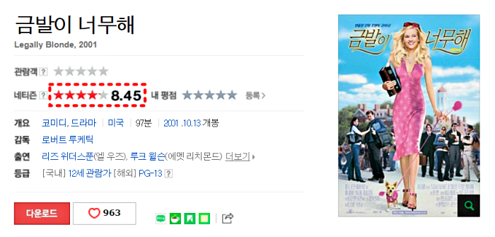 이 영화는 2001년 국내에 개봉하였고, 리즈 위더스푼이 '엘 우즈'라는 캐릭터를 맡아 대대적으로 인기를 끌었었습니다.