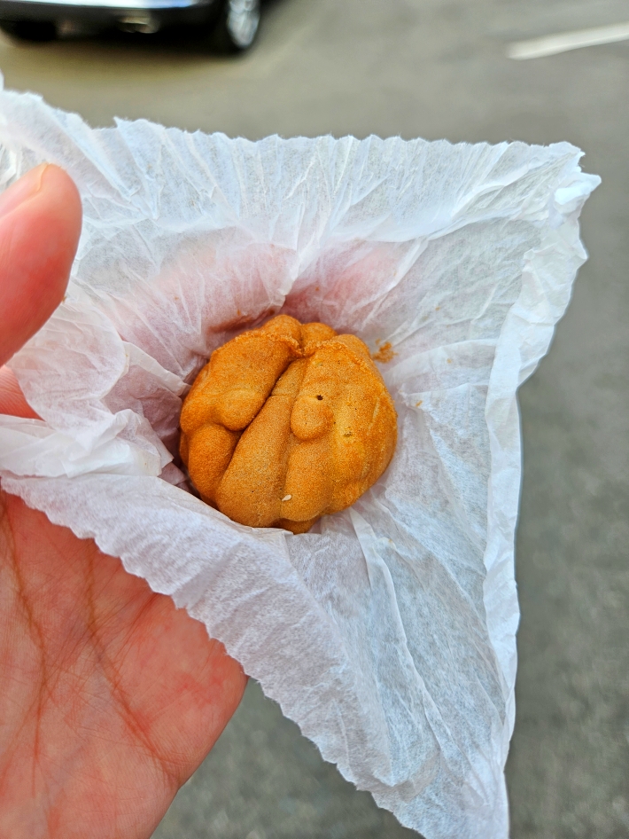 호두과자는 하나하나 개별로 포장되어 있었습니다. 방금 나온 것은 아니기 때문에 따뜻하진 않았습니다. 하지만 천안 호두과자는 차갑게 먹어도 맛있는 디저트이기 때문에 딱히 개의치 않았습니다.