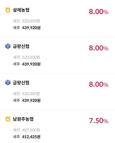 이때 가장 높은 금리는 새마을금고였습니다, 무려 10%대의 이자를 제공하고 있는 것을 확인할 수 있습니다. 단, 10%대 새마을금고 같은 경우는 직접 방문해야만 가능하며, 전 지역에서 진행하고 있는 것이 아니라는 부분이 걸림돌입니다.