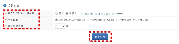 만약 집에 프린터기가 연결되어 있다면 [인터넷발급(프린트출력)]을 이용하셔도 됩니다.